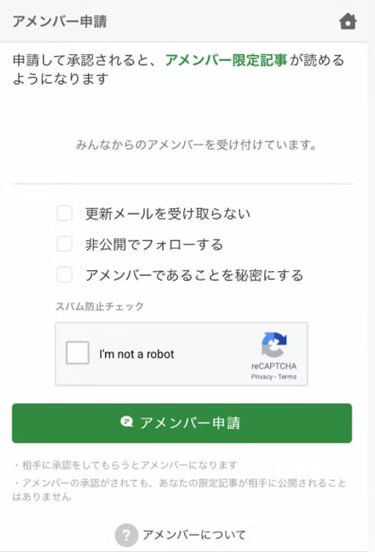 A. 限定ブログはアメーバブログにて公開しています。ブログを閲覧するには、アメンバー申請が必要です。ブログ記事を開くと、「アメンバー限定記事を読む」というボタンがあるので、そこをクリックしてください。すると2つ目の画像の画面に飛びますので、「I’m not a robot」にチェックを入れて、「アメンバー申請」のボタンをクリックしてください。
